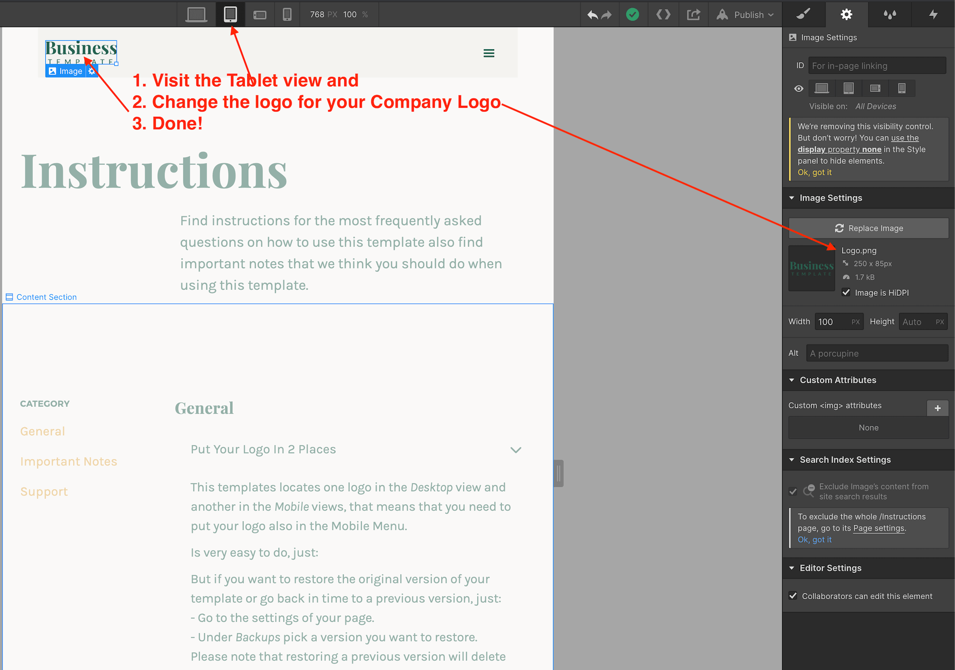 Is very easy to do, just visit the Tablet view and replace the current logo with yours.