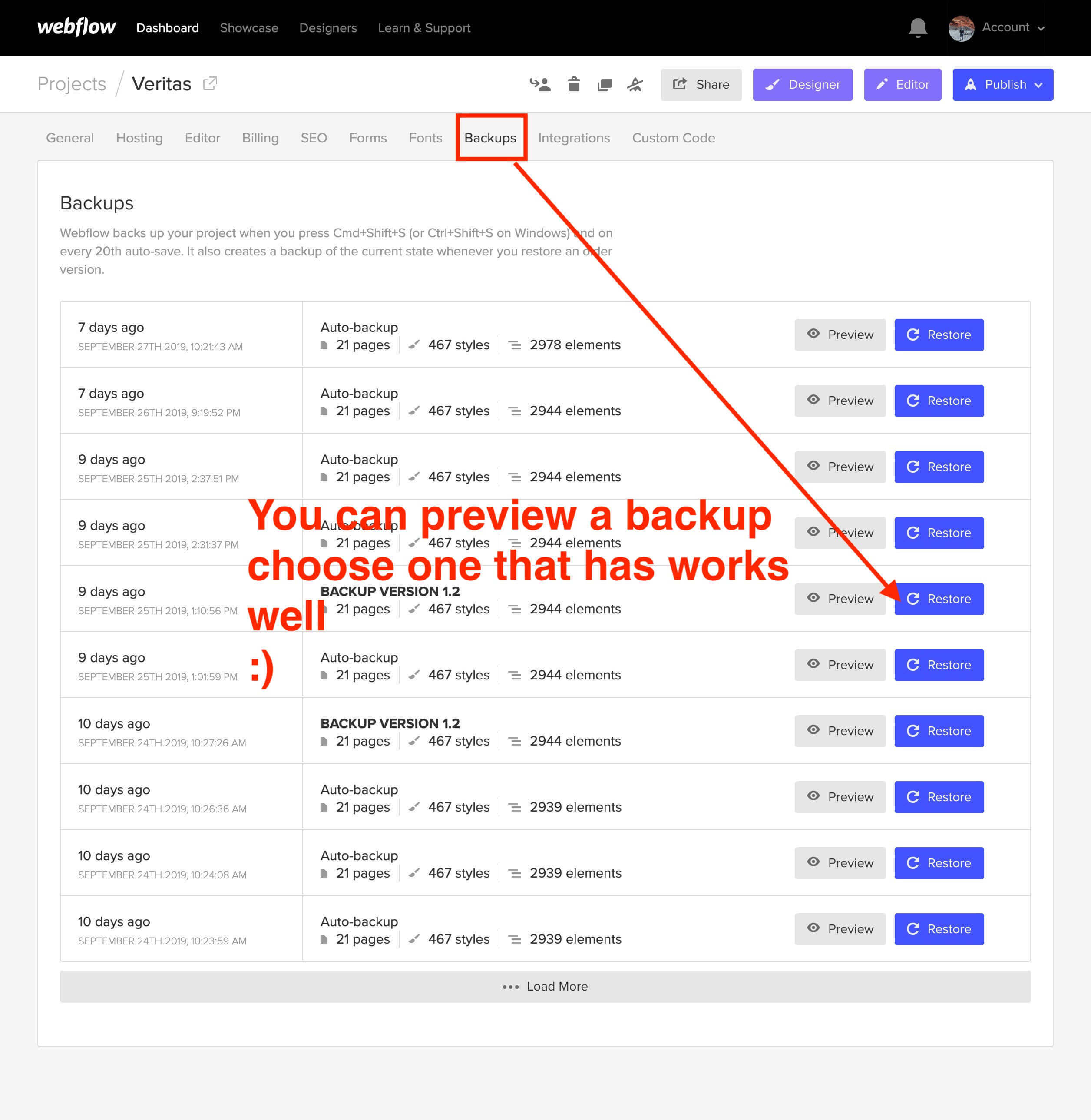 - Under Backups pick a version you want to restore.